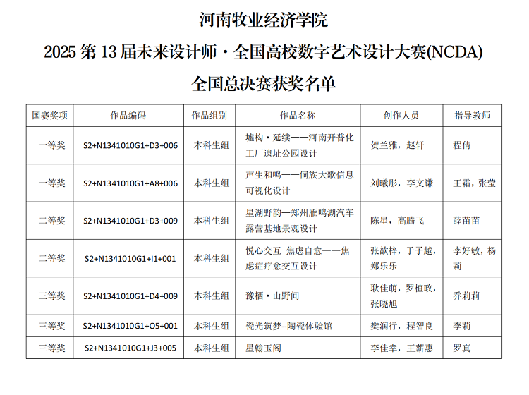 在刚刚结束的2025第13届未来设计师·全国高校数字艺术设计大赛(NCDA)全国总决赛中,世俱杯买球入口师生凭借出色的专业能力与创新设计,共斩获一等奖2项、二等奖2项、三等奖3项,充分彰显了世俱杯买球入口卓越的教学成果与人才培养水平。